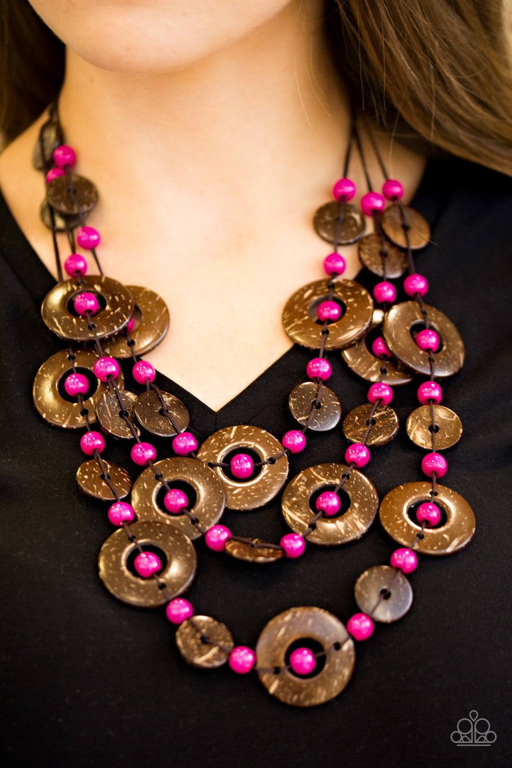 Brushed in a distressed finish, wooden discs link into three summery rows below the collar. Round pink beads are knotted between the wooden accents, adding colorful accents to the seasonal palette. Features a button loop closure.