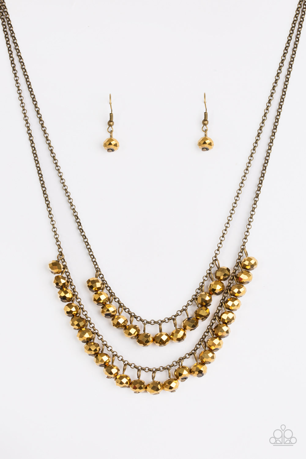 Brushed in a metallic finish, faceted aurum beads swing from the bottom of layered brass chains, creating a bold fringe below the collar. Features an adjustable clasp closure.