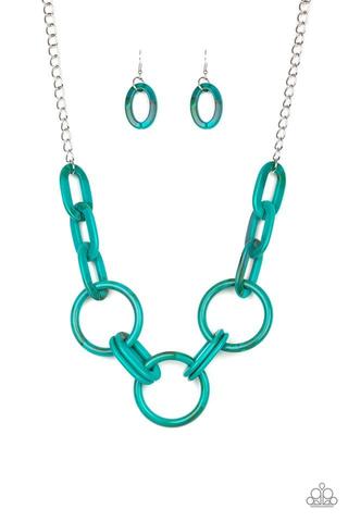 Suspended from a shimmery silver chain, a collision of acrylic blue links connect below the collar in a statement-making fashion. Features an adjustable clasp closure.